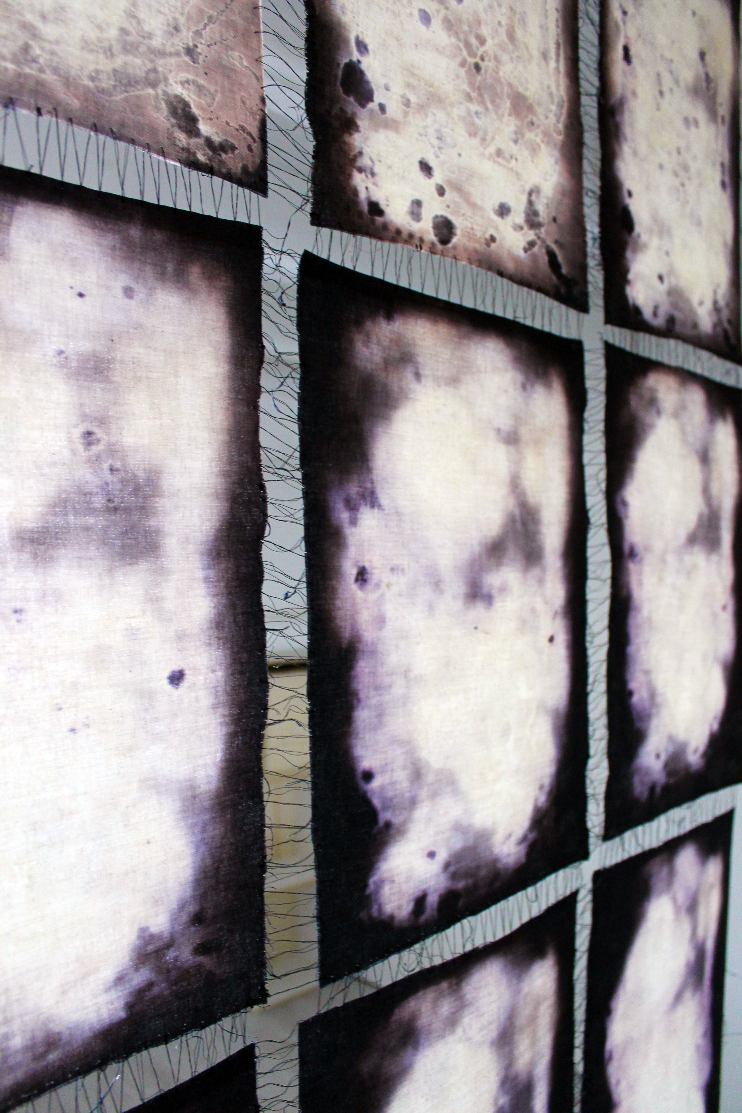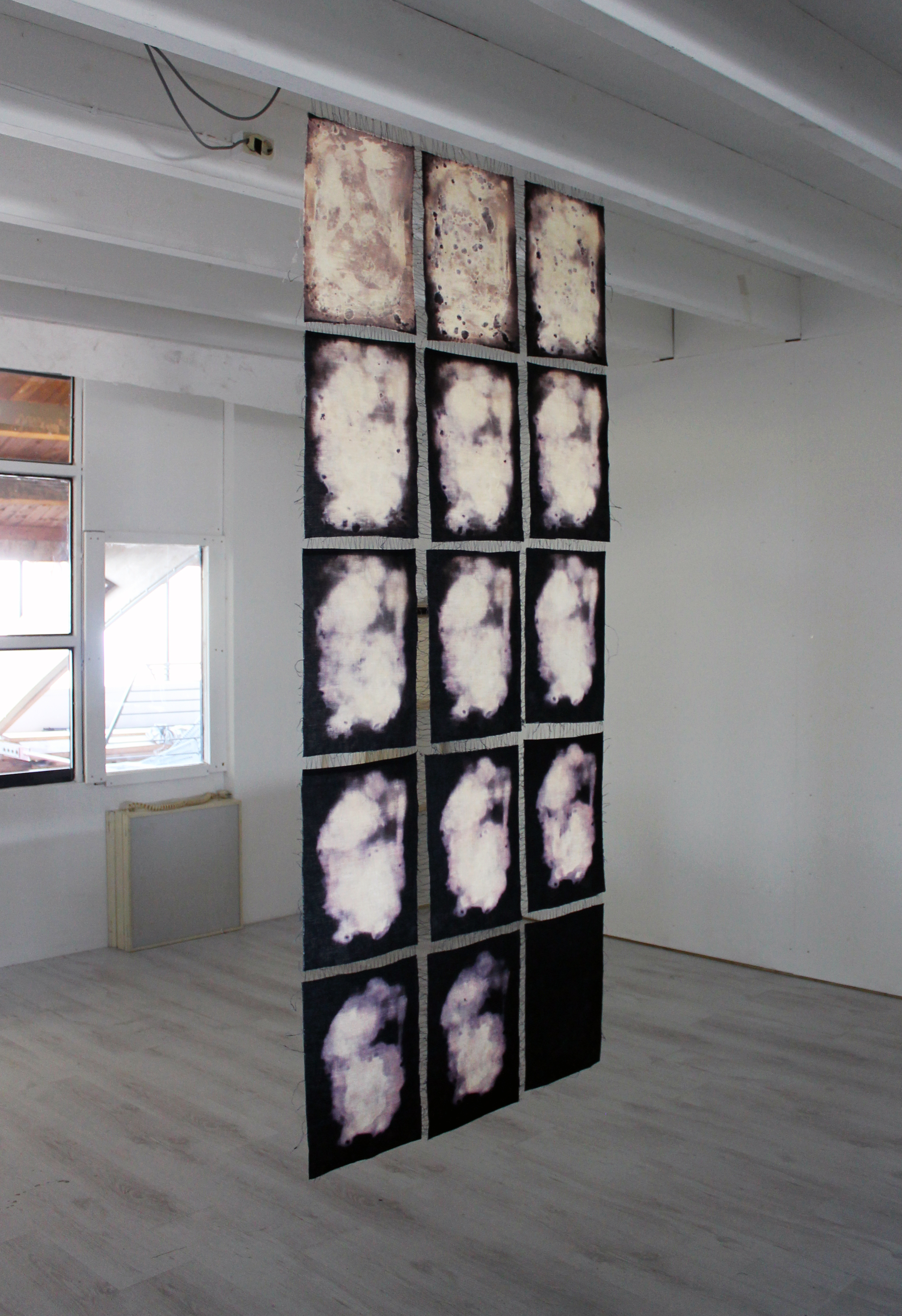 ‘Clouds’ is a piece I just finished using the same technique as in my previous project What’s Inside Black? – I stripped away layers of color using discoloration chemicals and a heat press. I have already done this part last year, what I added was the display installation: the textile pieces have been hardened and connected by cotton thread. Nice to see it hanging in my studio!