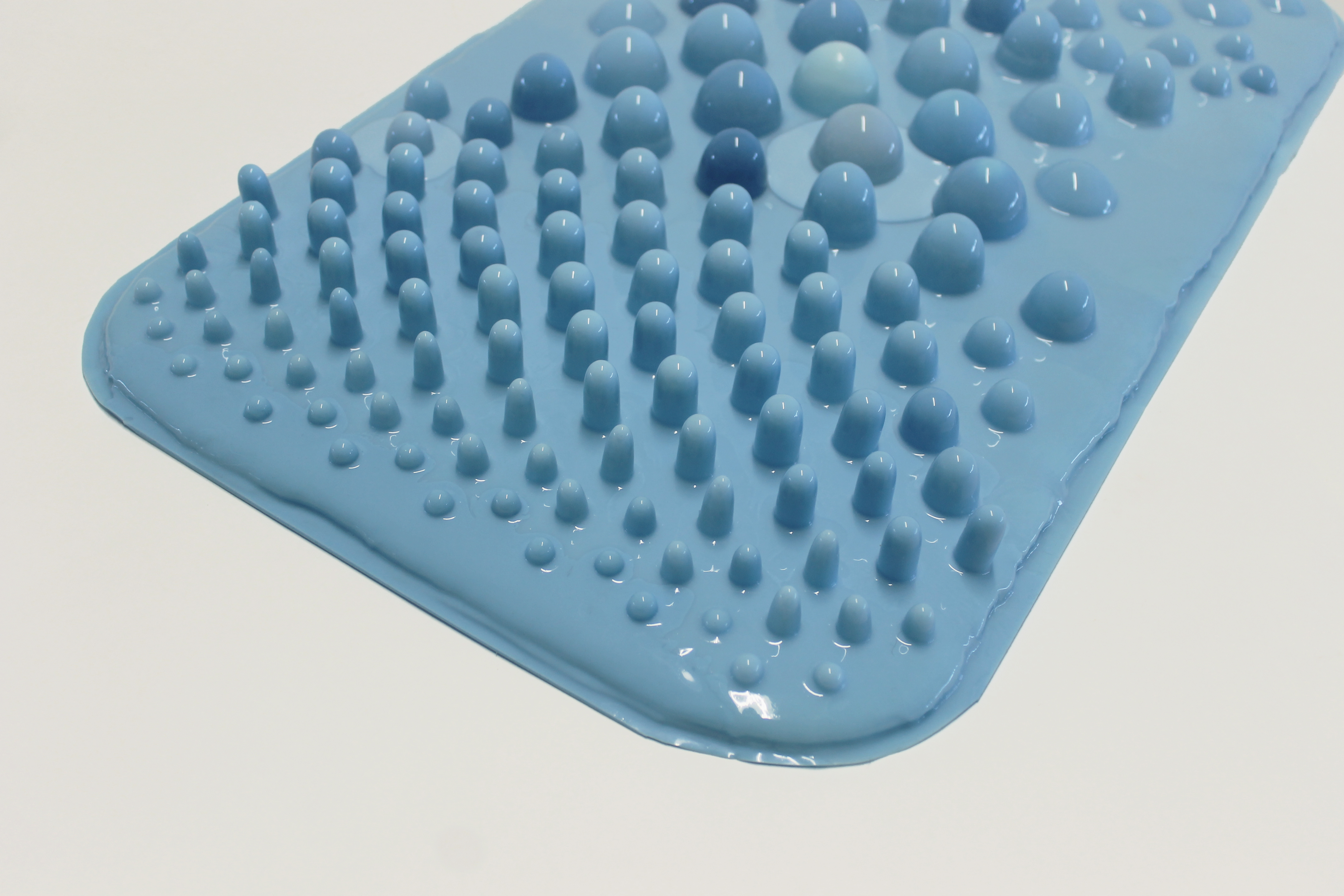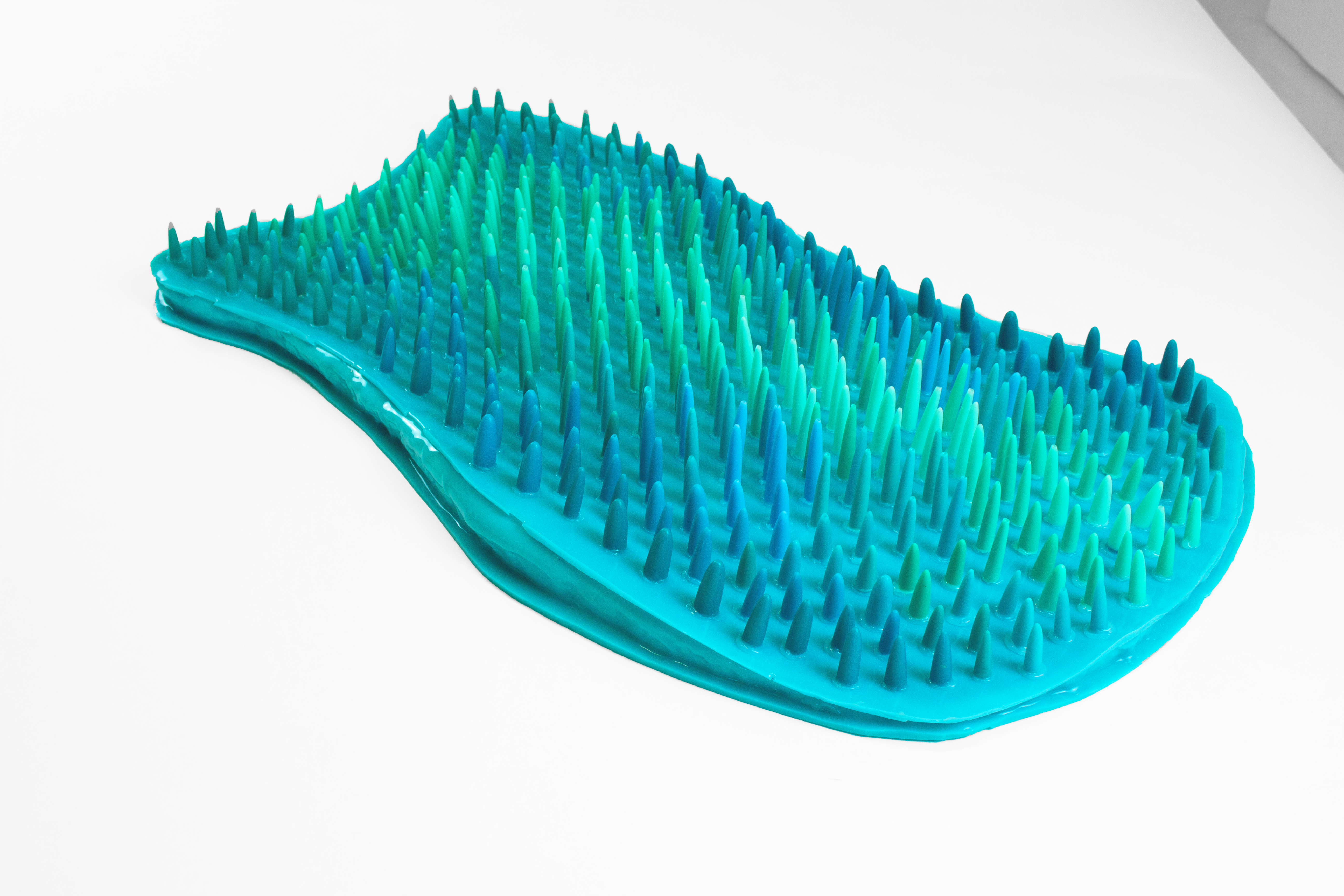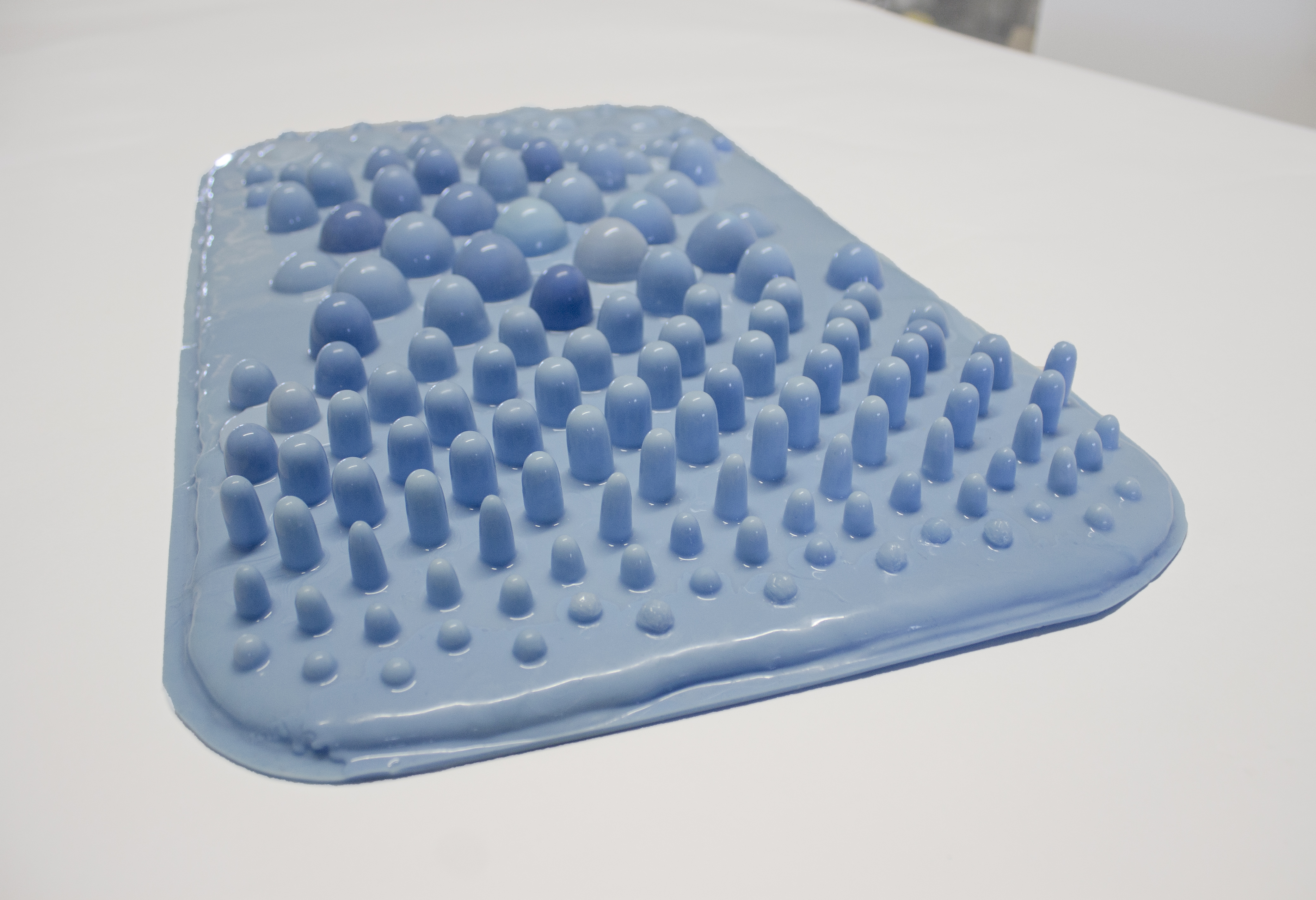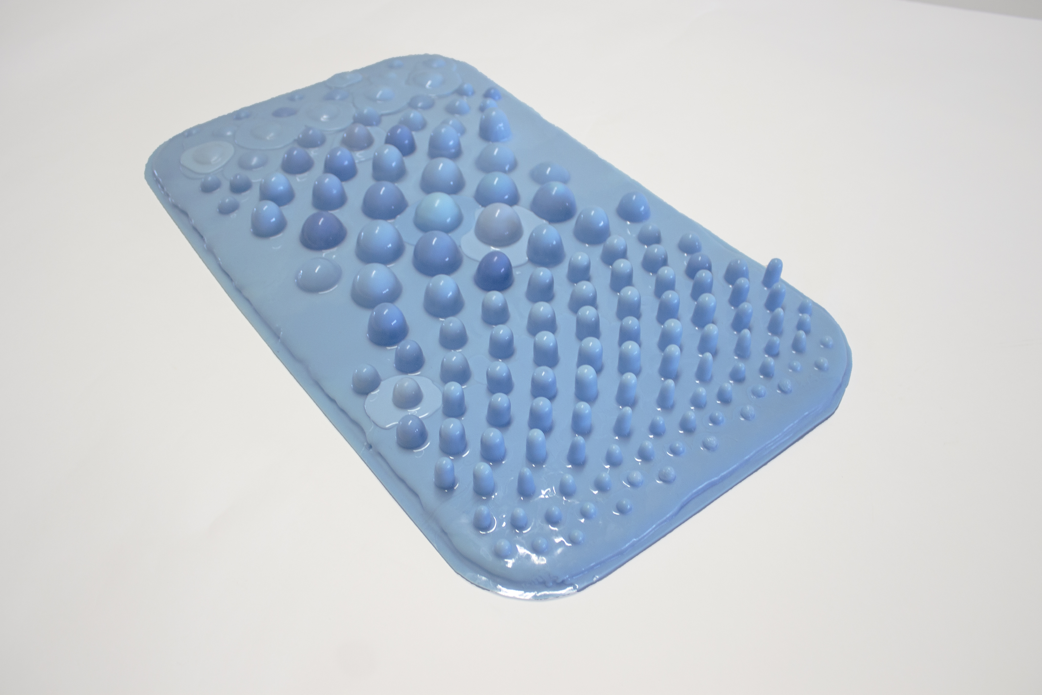 The TACTimat is a sculpture from which flexible, silicone shapes (buttons) rise. Their shape and grid composition were chosen to be aesthetically pleasing and to invite exploration through touch. The buttons rely on biomimetic inspiration (inspired by body parts, in the case of the first prototype each button is approximating the dimensions of human fingers.) While the shape is mostly fixed, they differ in height, density, and tip profile. Most of these tactile qualities are apparent by just looking, while to discover others, like density and texture, one has to effectively touch them.