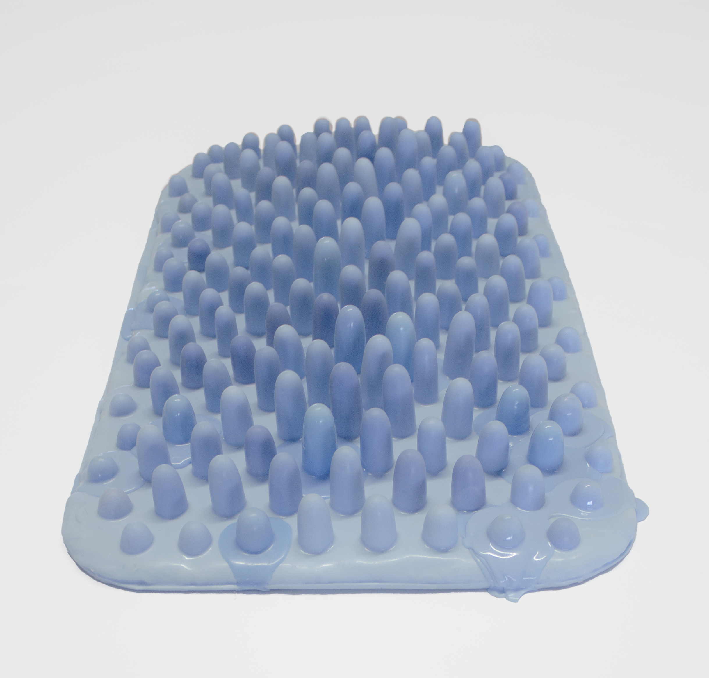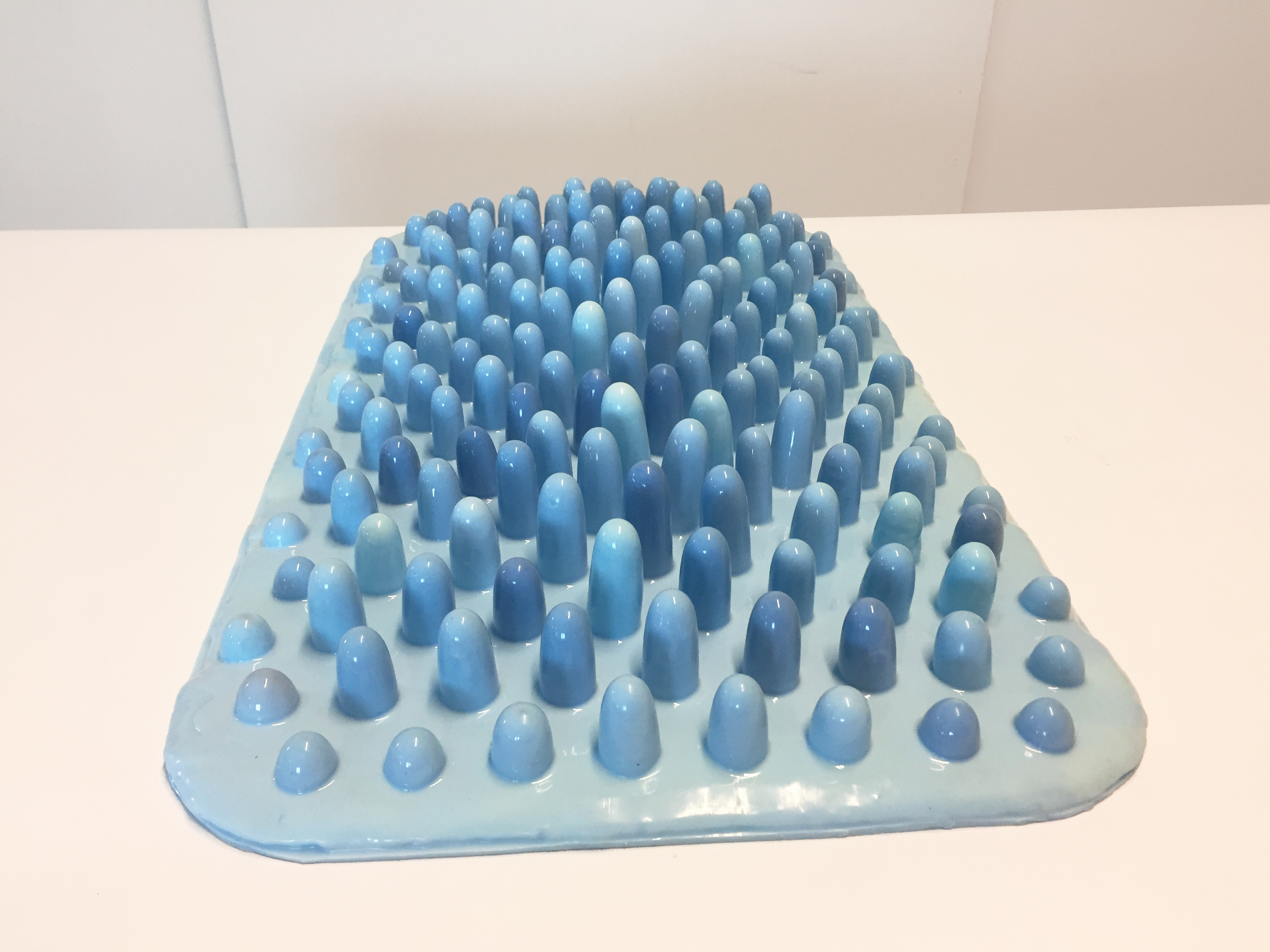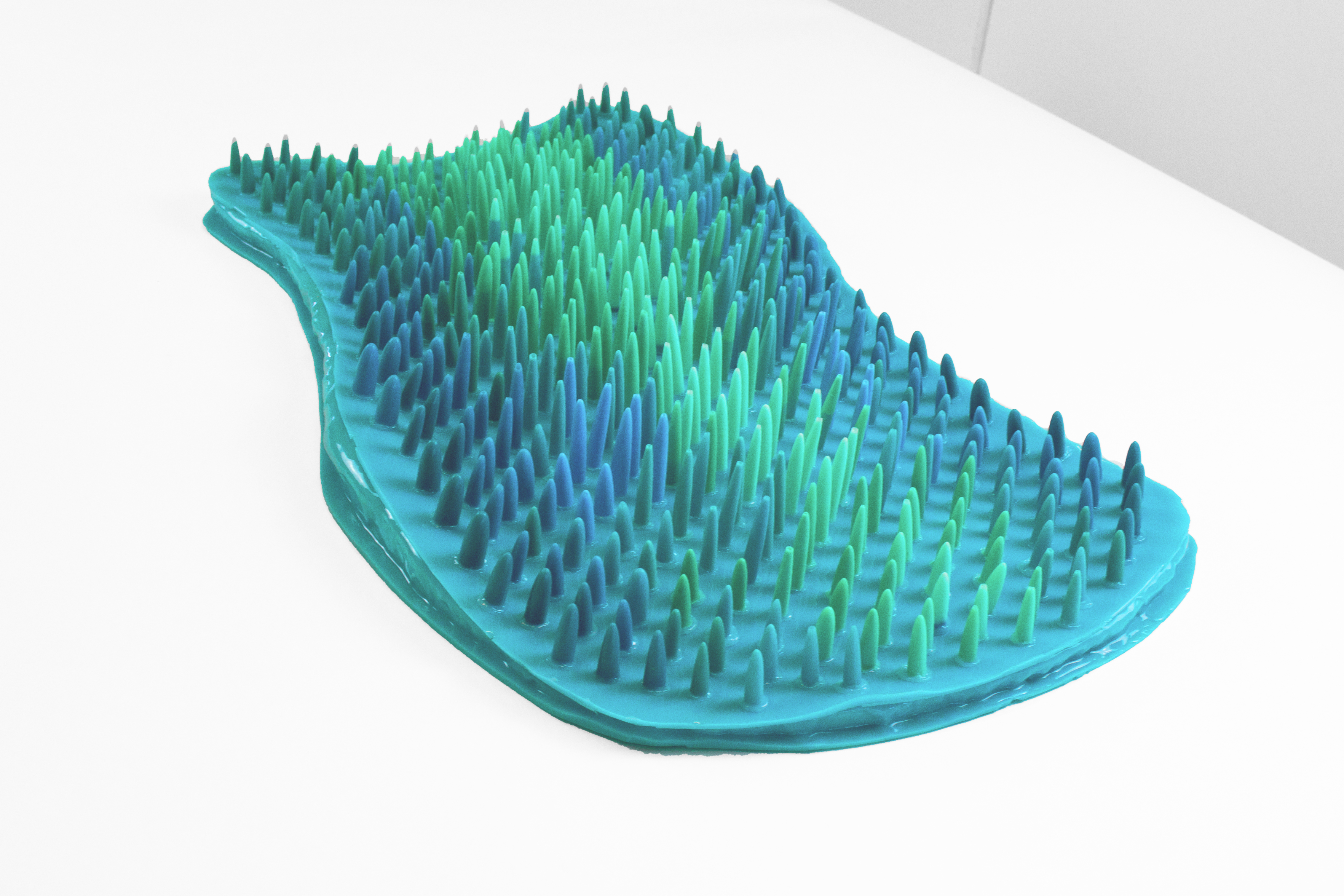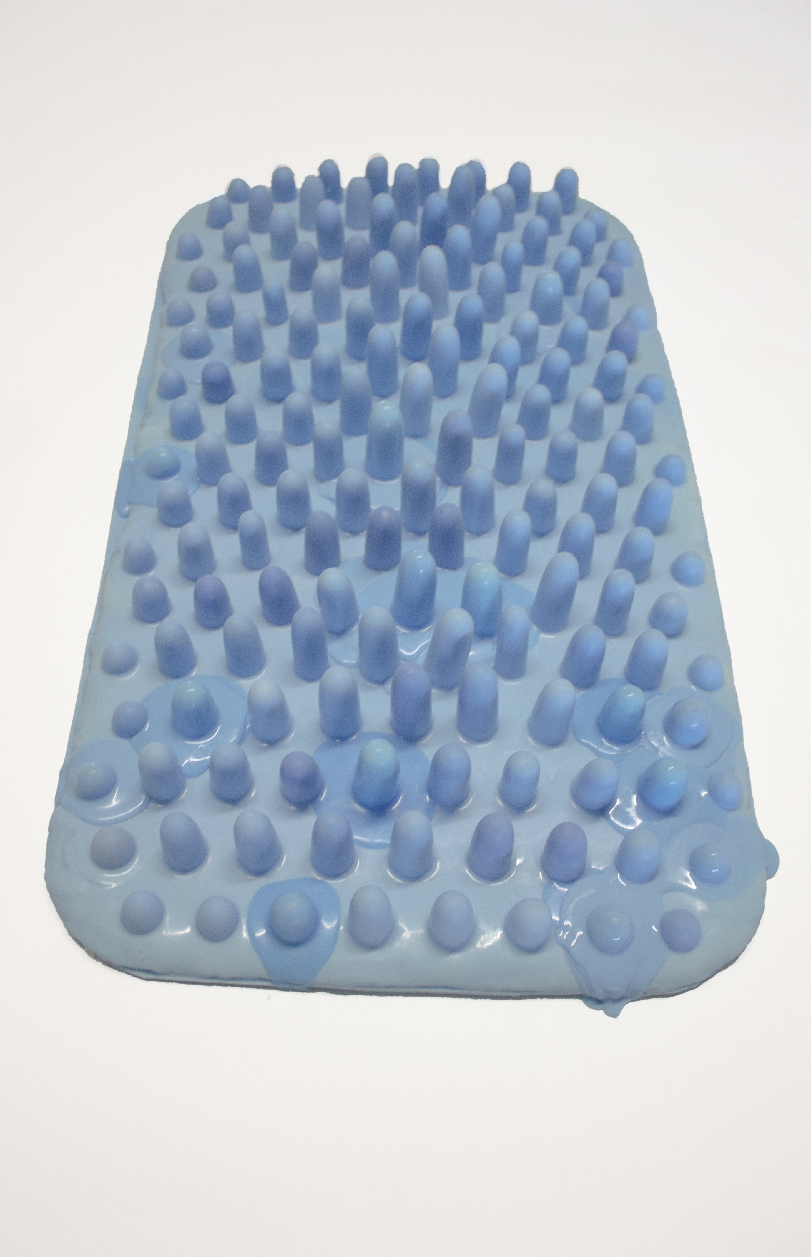 The TACTimat is a sculpture from which flexible, silicone shapes (buttons) rise. Their shape and grid composition were chosen to be aesthetically pleasing and to invite exploration through touch. The buttons rely on biomimetic inspiration (inspired by body parts, in the case of the first prototype each button is approximating the dimensions of human fingers.) While the shape is mostly fixed, they differ in height, density, and tip profile. Most of these tactile qualities are apparent by just looking, while to discover others, like density and texture, one has to effectively touch them.