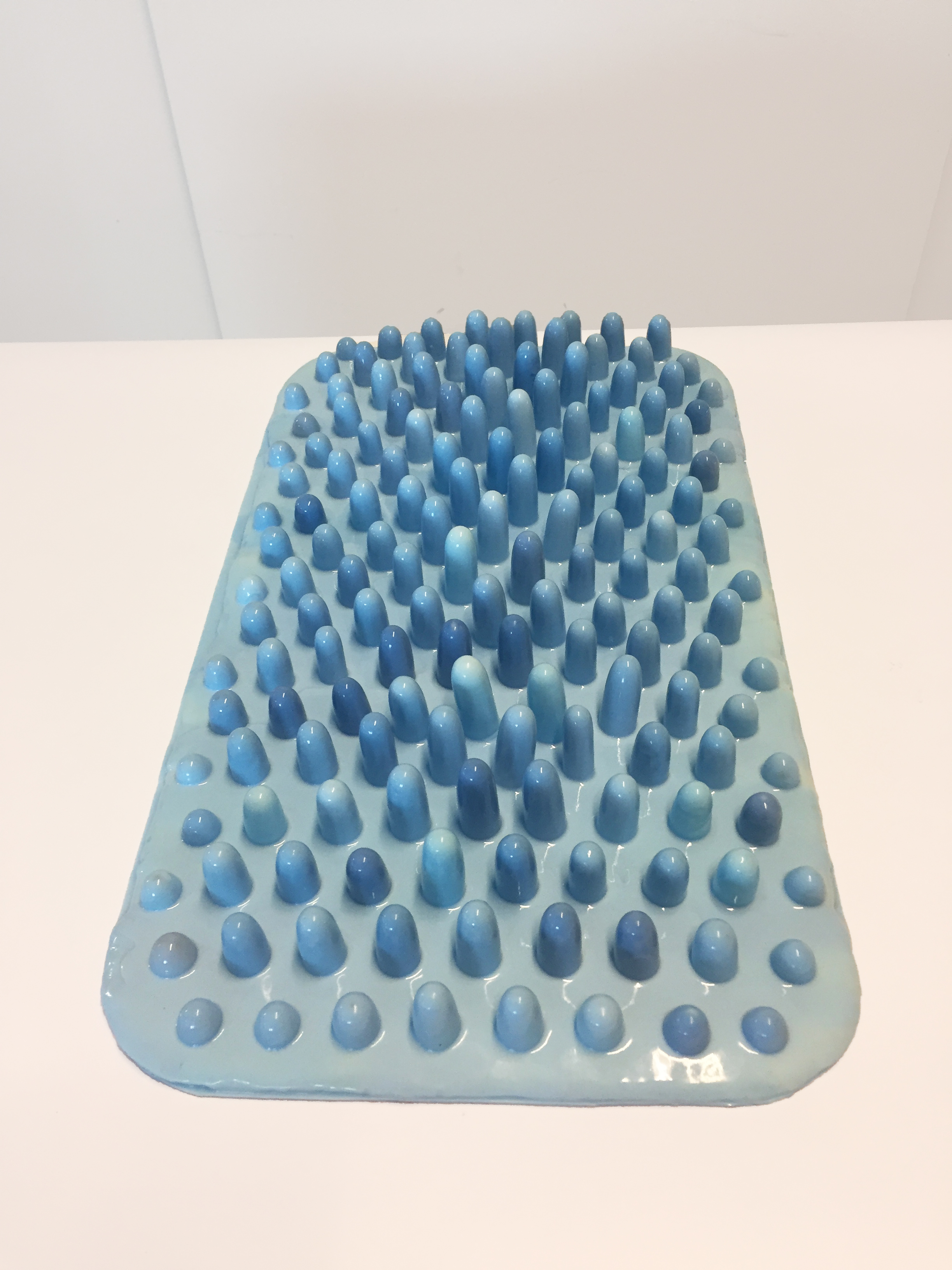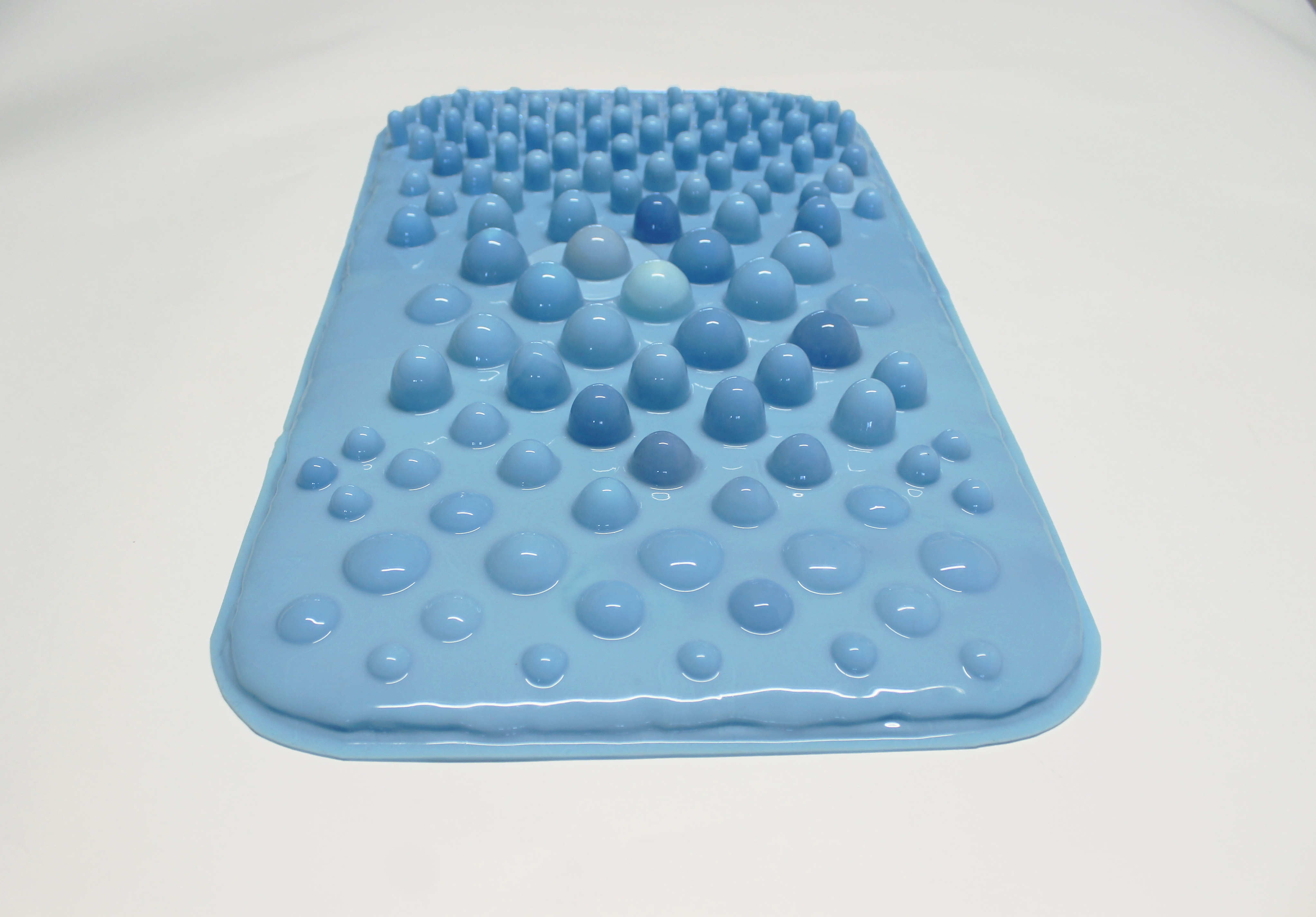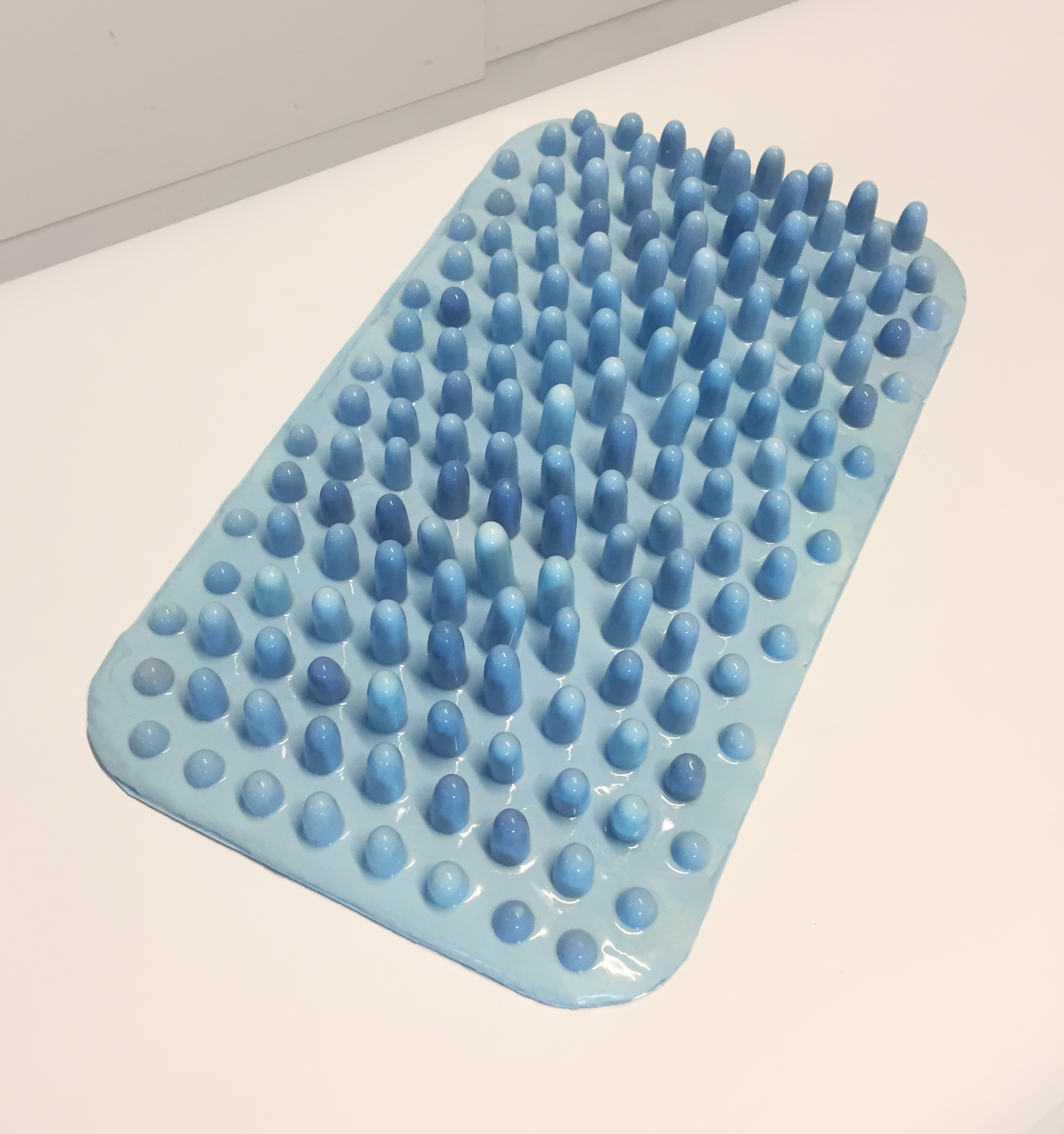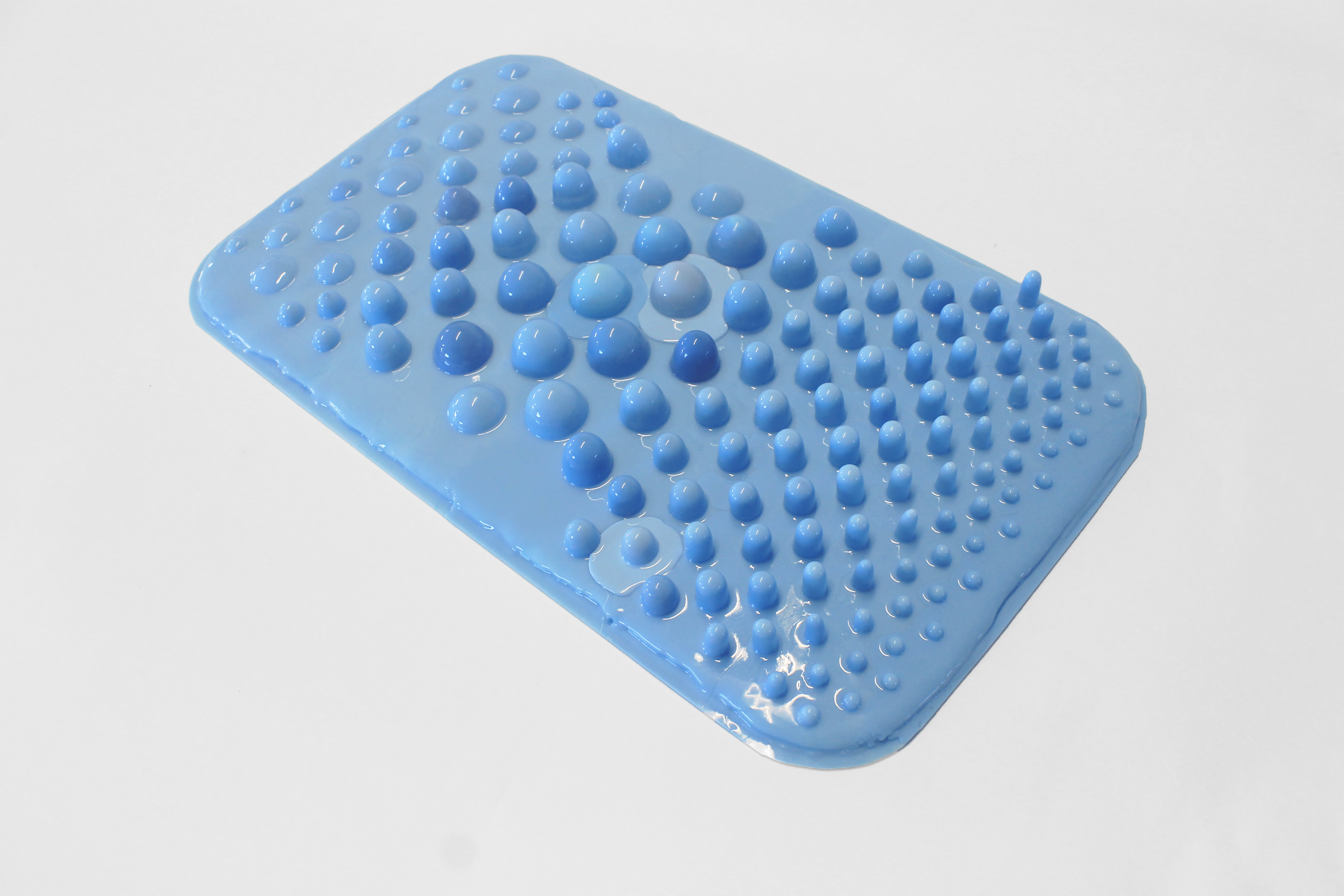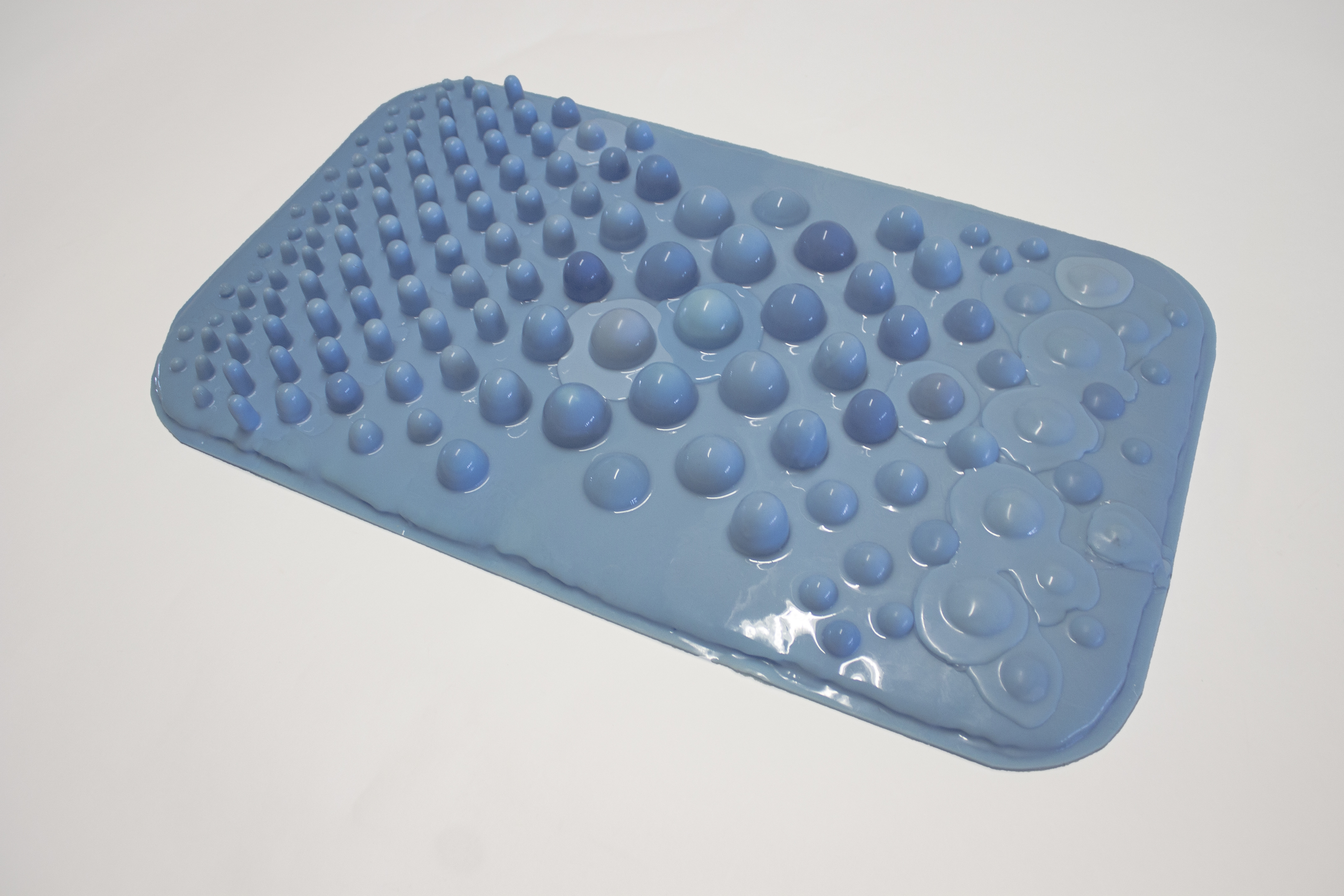 The TACTimat is a sculpture from which flexible, silicone shapes (buttons) rise. Their shape and grid composition were chosen to be aesthetically pleasing and to invite exploration through touch. The buttons rely on biomimetic inspiration (inspired by body parts, in the case of the first prototype each button is approximating the dimensions of human fingers.) While the shape is mostly fixed, they differ in height, density, and tip profile. Most of these tactile qualities are apparent by just looking, while to discover others, like density and texture, one has to effectively touch them.