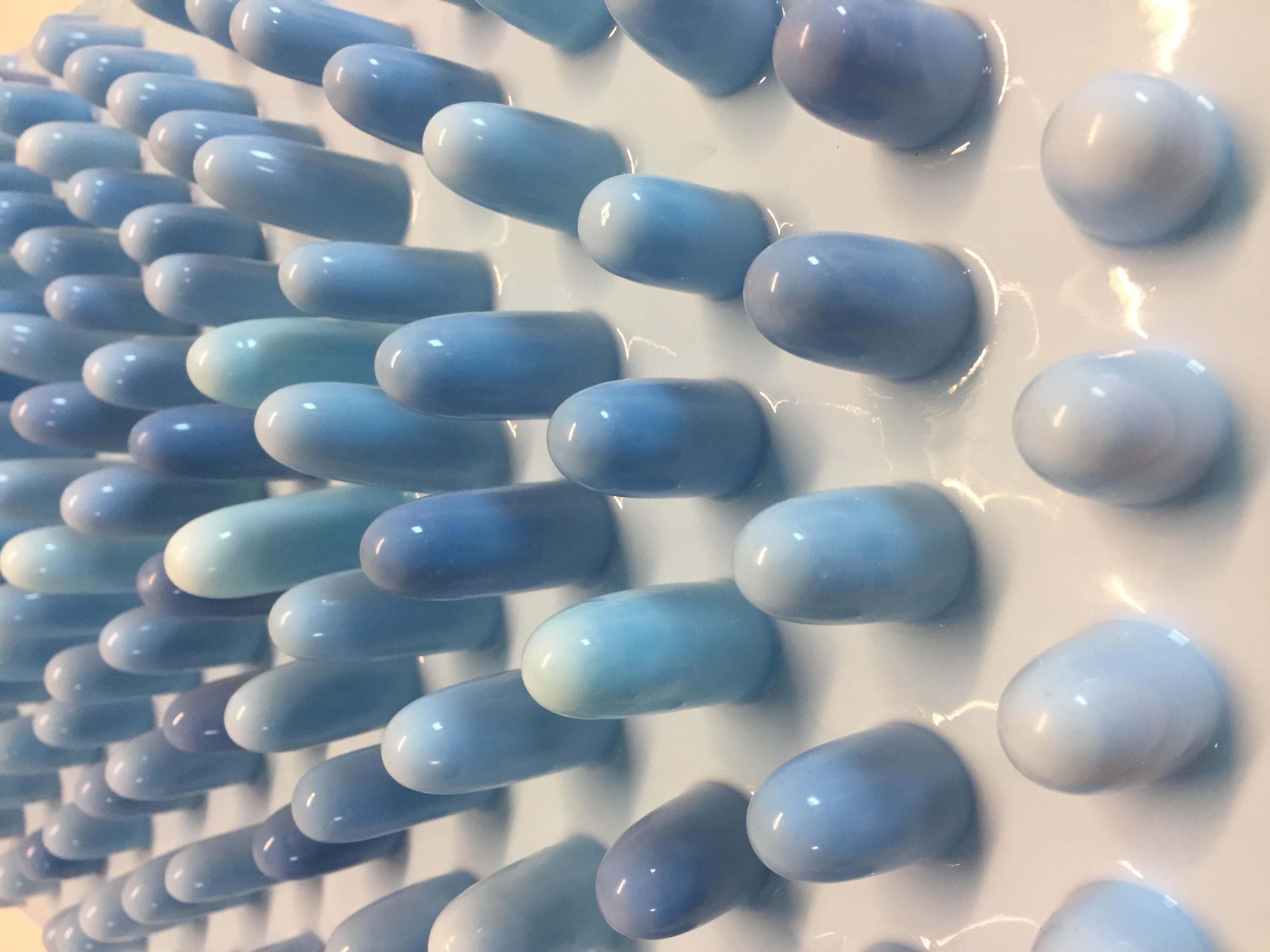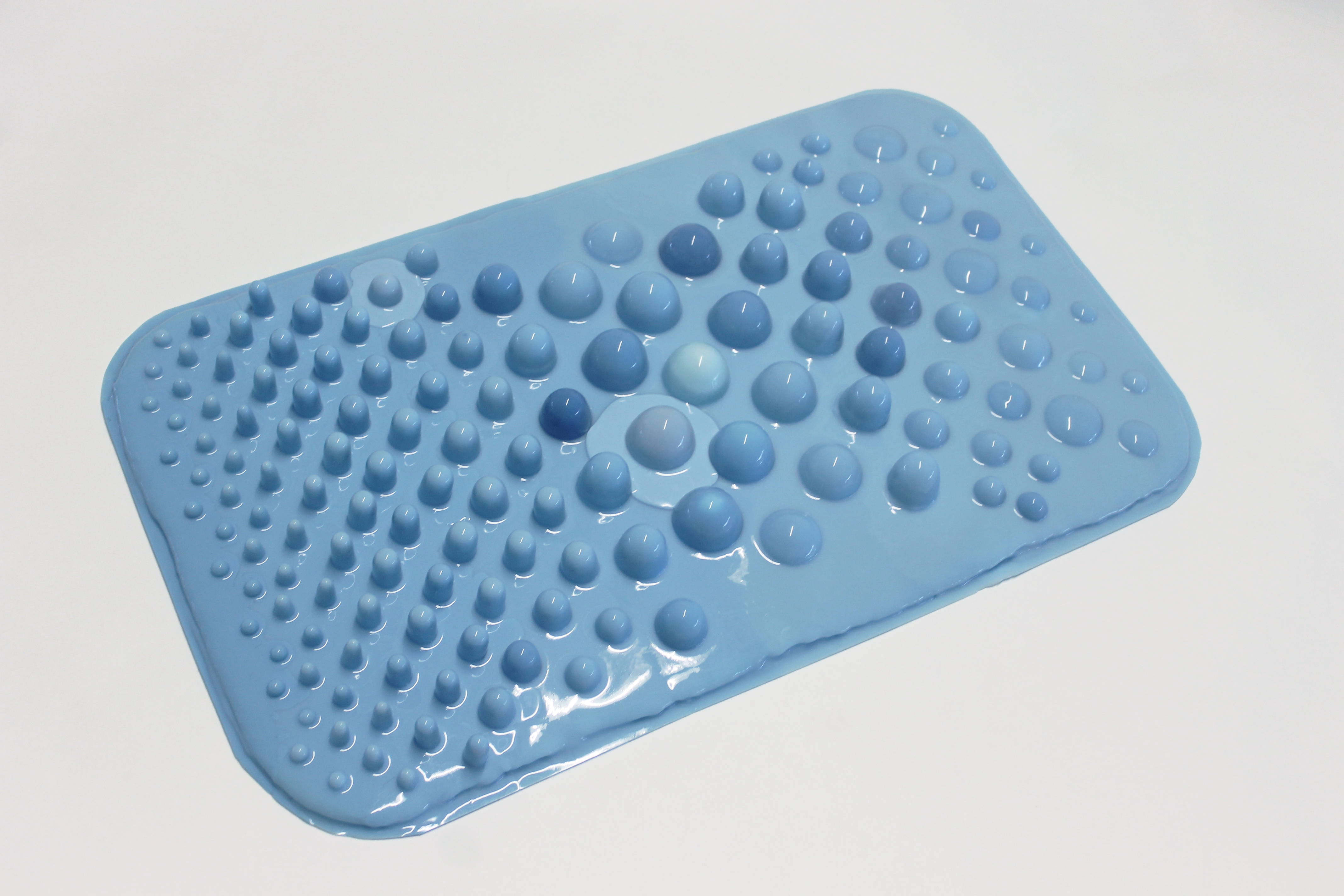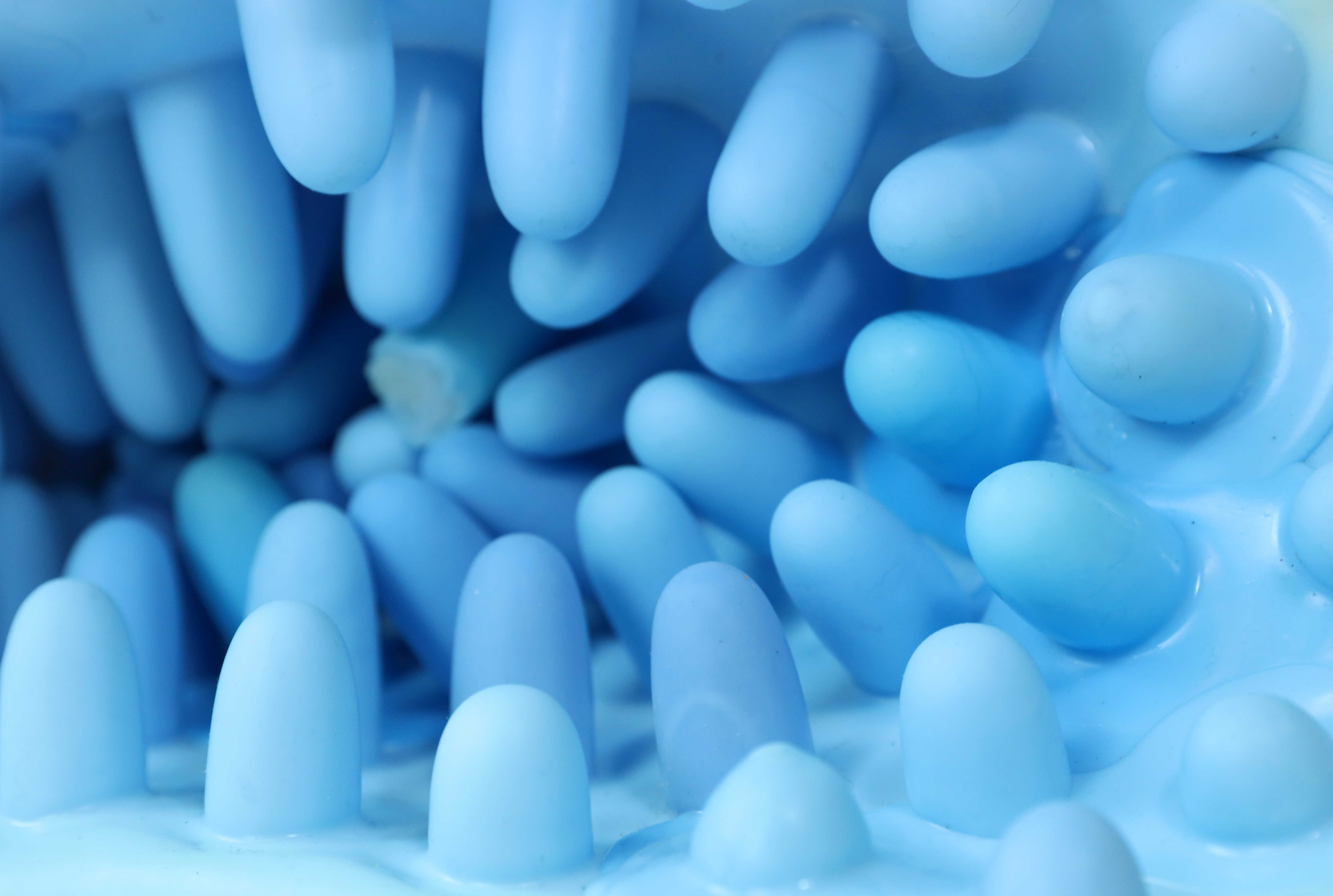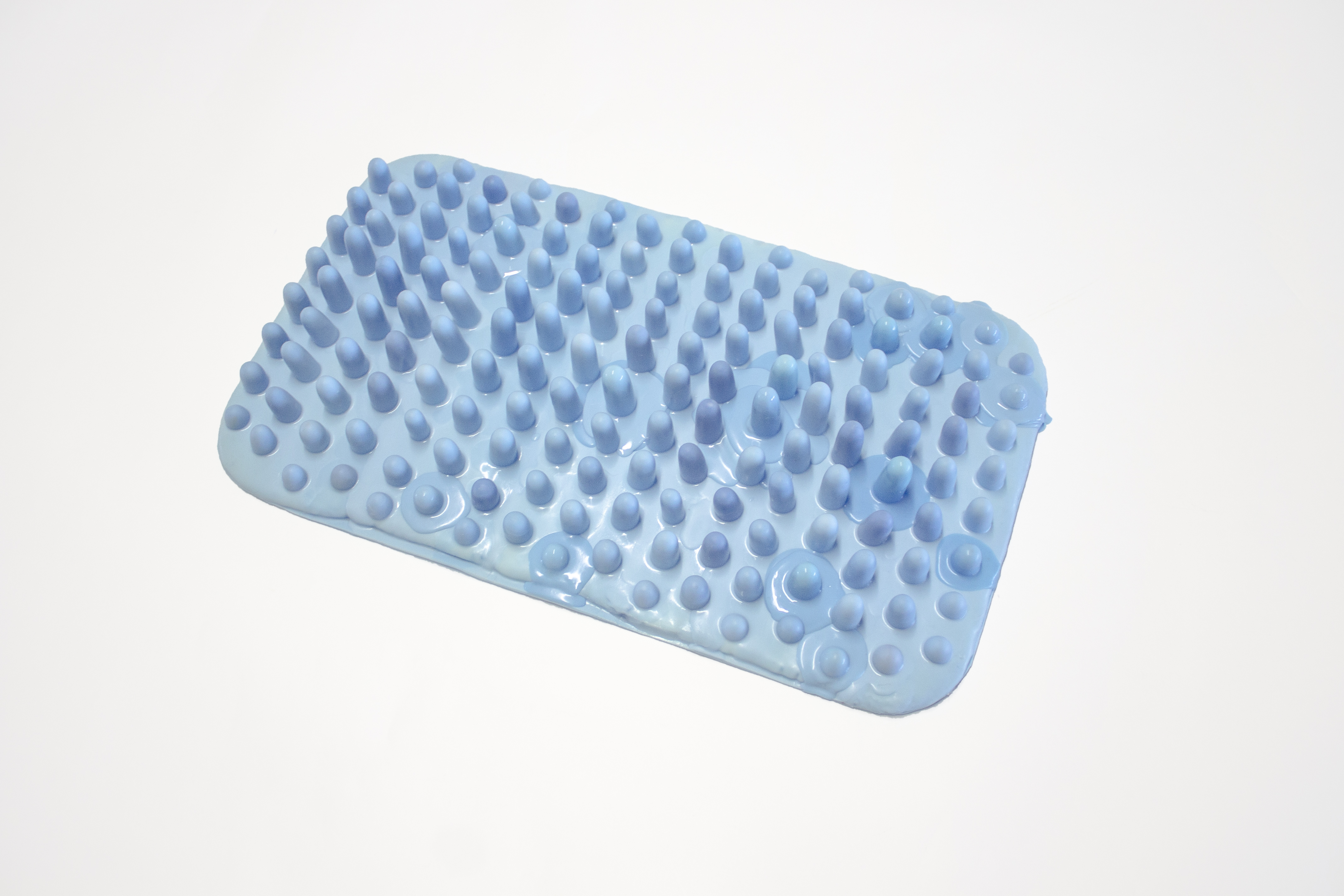 The TACTimat is a sculpture from which flexible, silicone shapes (buttons) rise. Their shape and grid composition were chosen to be aesthetically pleasing and to invite exploration through touch. The buttons rely on biomimetic inspiration (inspired by body parts, in the case of the first prototype each button is approximating the dimensions of human fingers.) While the shape is mostly fixed, they differ in height, density, and tip profile. Most of these tactile qualities are apparent by just looking, while to discover others, like density and texture, one has to effectively touch them.