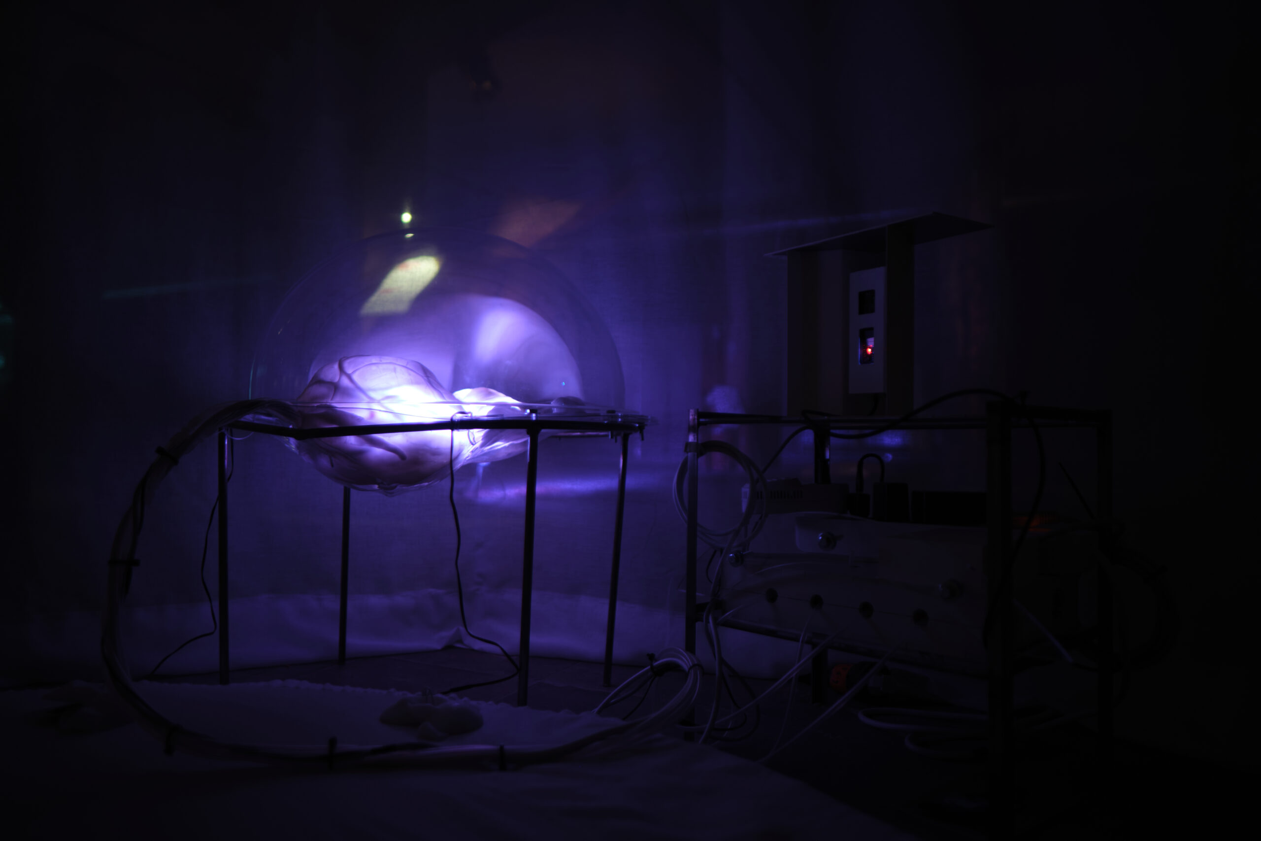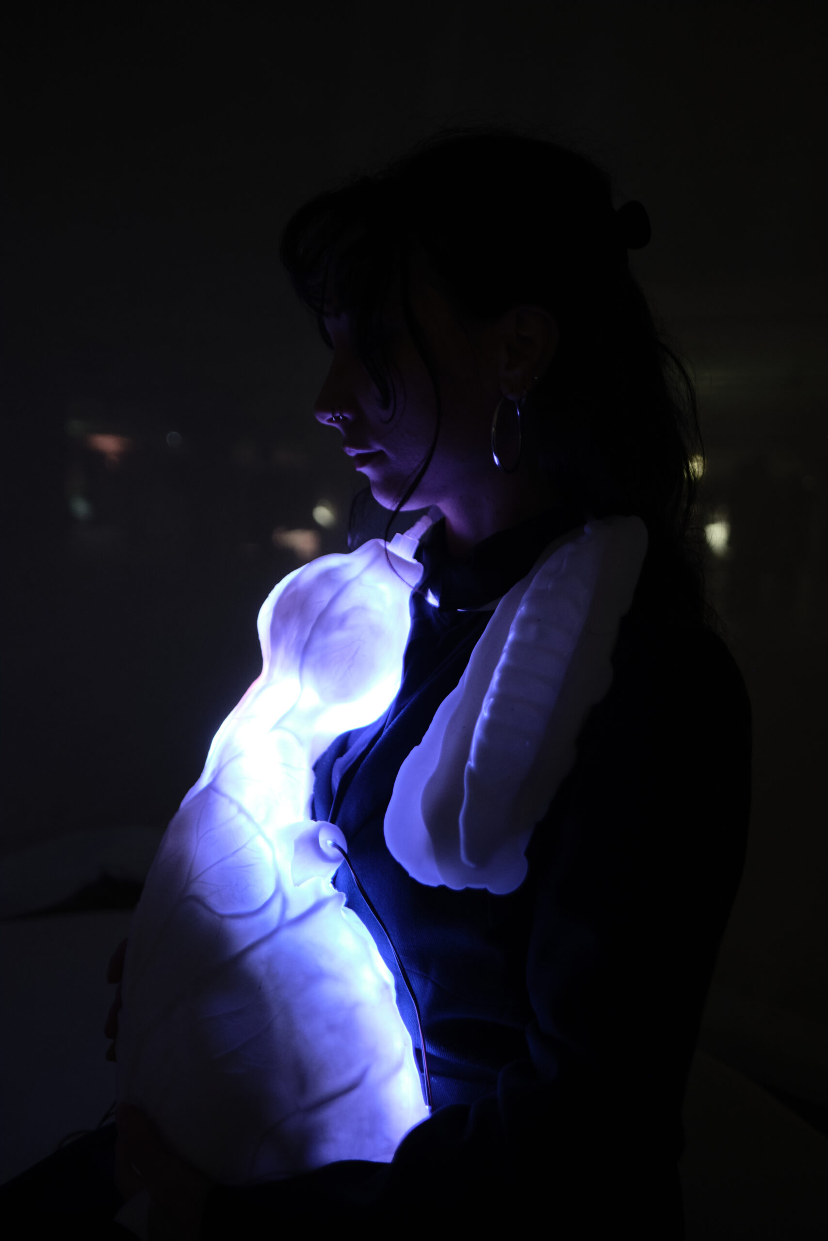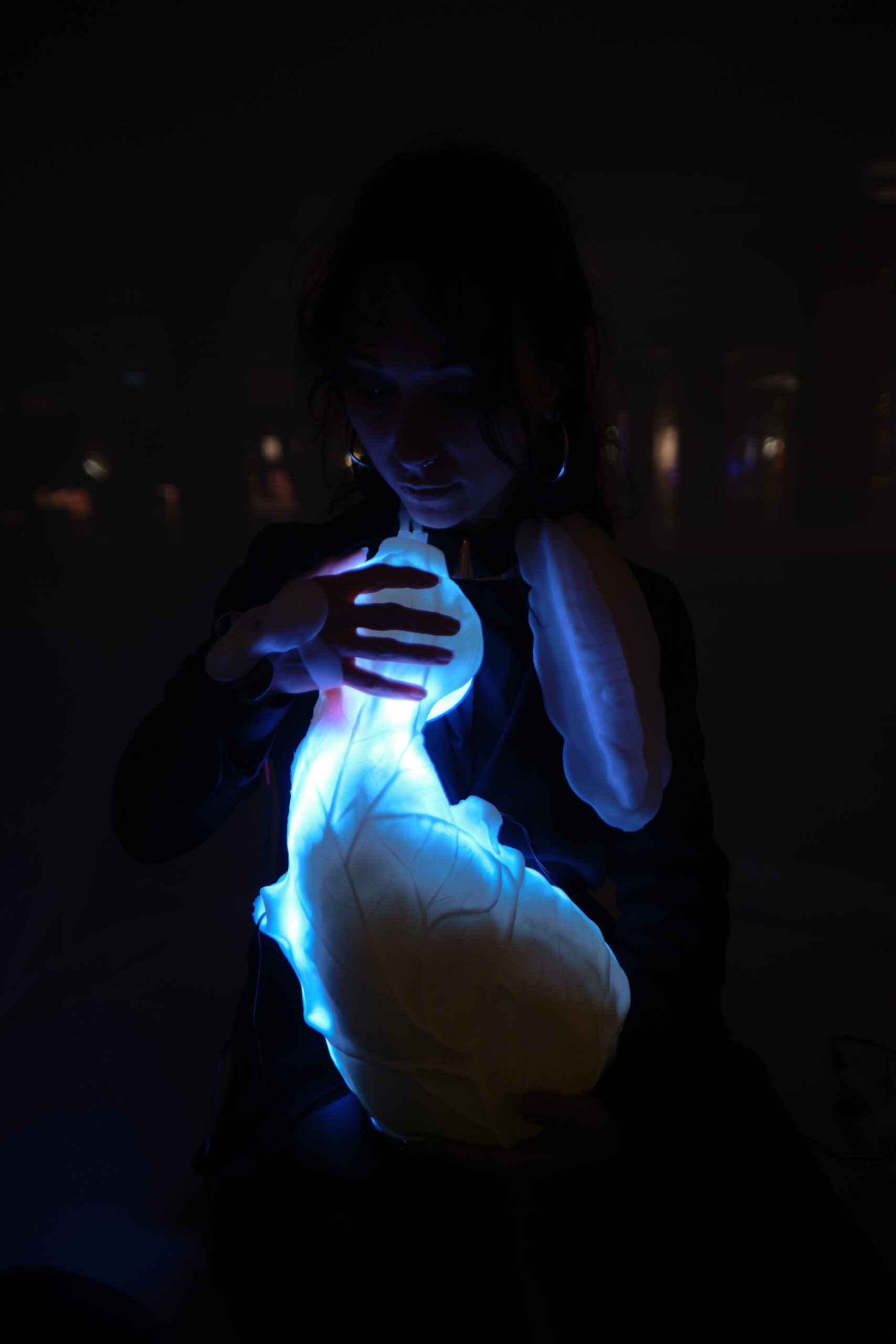 The installation features two sculptures resembling alien organs or fetuses, which serve both as visual metaphors and interactive devices. Two participants enter from opposite sides and engage with the sculptures without seeing each other. Their interaction is mediated through Mediated Social Touch (MST), a haptic technology framework in which touch is simulated and transmitted over distances, enabling remote bodily communication. The sculptures become animated by the presence of the visitors and their physiological data, detected using radar sensors. This technology captures biometric signals, such as heartbeat and breath rate, and transmits them to the other participant. In this way, they feel each other’s bodily rhythms, as well as temperature, through the sculptures which they can hold in their arms like a baby. The data is interpreted and visualised via light, vibration, and movement.