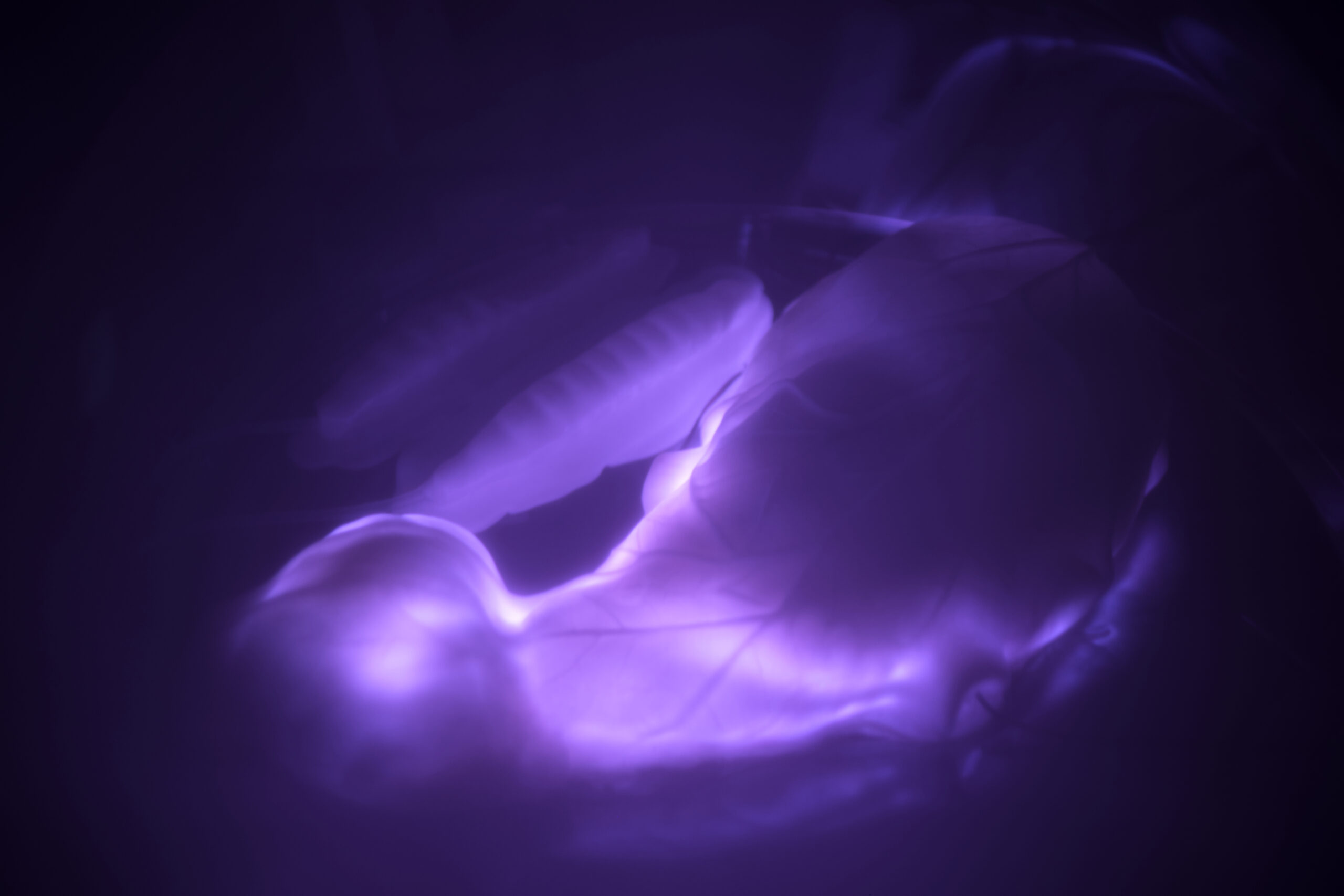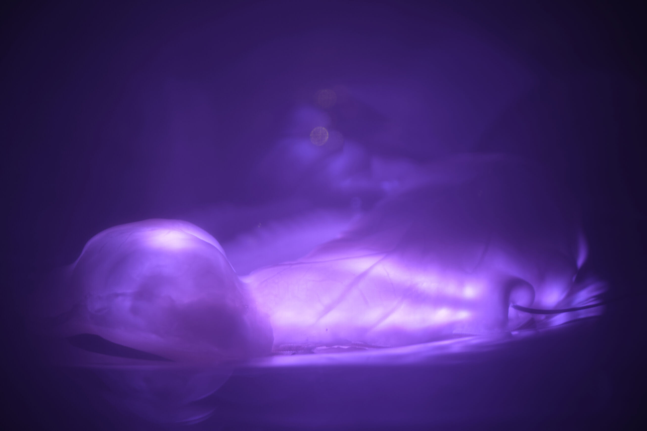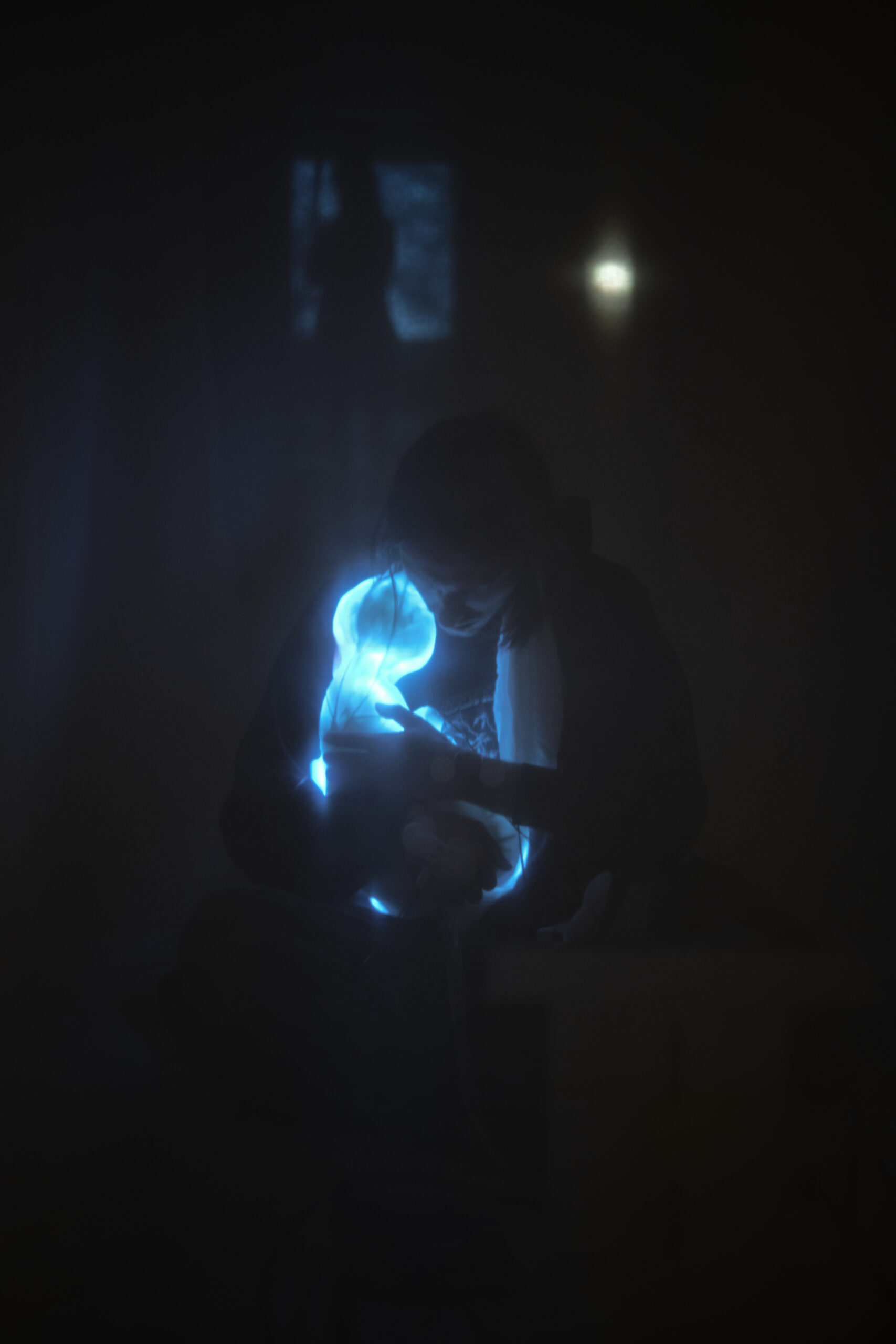 The installation features two sculptures resembling alien organs or fetuses, which serve both as visual metaphors and interactive devices. Two participants enter from opposite sides and engage with the sculptures without seeing each other. Their interaction is mediated through Mediated Social Touch (MST), a haptic technology framework in which touch is simulated and transmitted over distances, enabling remote bodily communication. The sculptures become animated by the presence of the visitors and their physiological data, detected using radar sensors. This technology captures biometric signals, such as heartbeat and breath rate, and transmits them to the other participant. In this way, they feel each other’s bodily rhythms, as well as temperature, through the sculptures which they can hold in their arms like a baby. The data is interpreted and visualised via light, vibration, and movement.