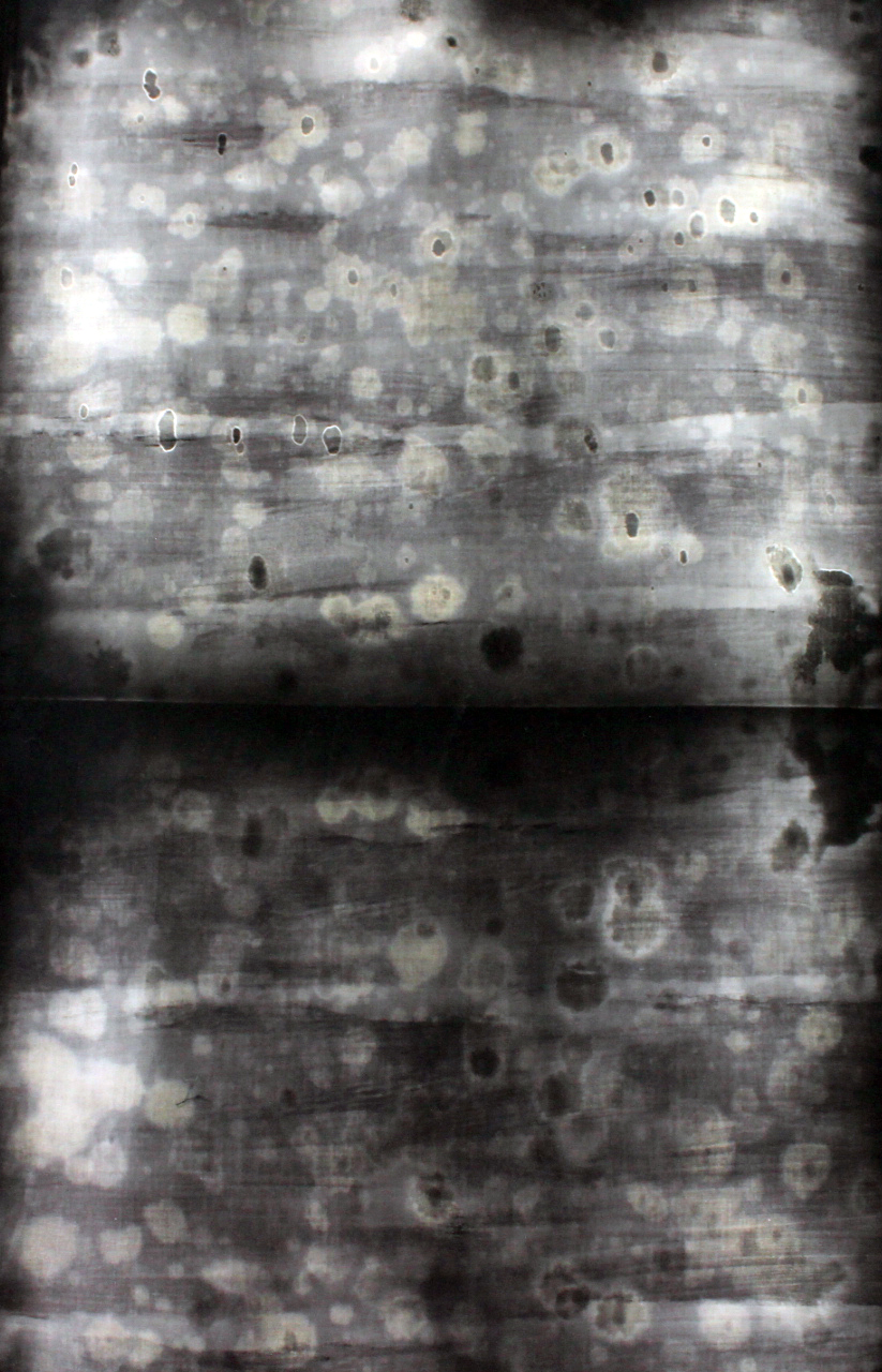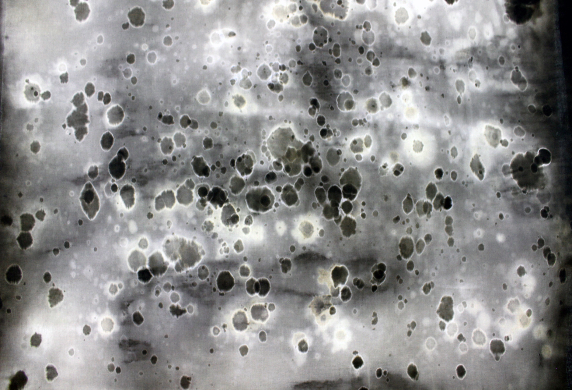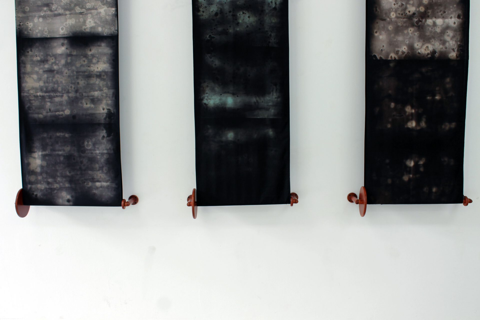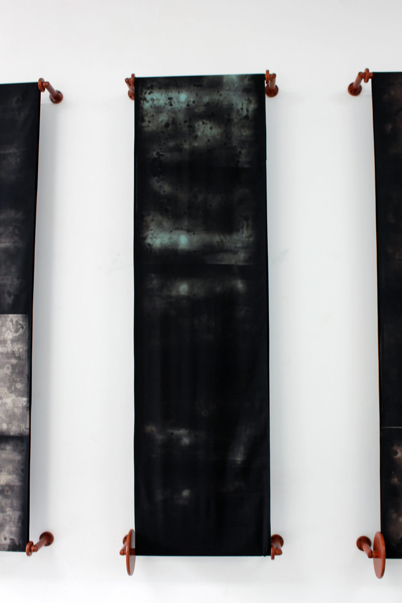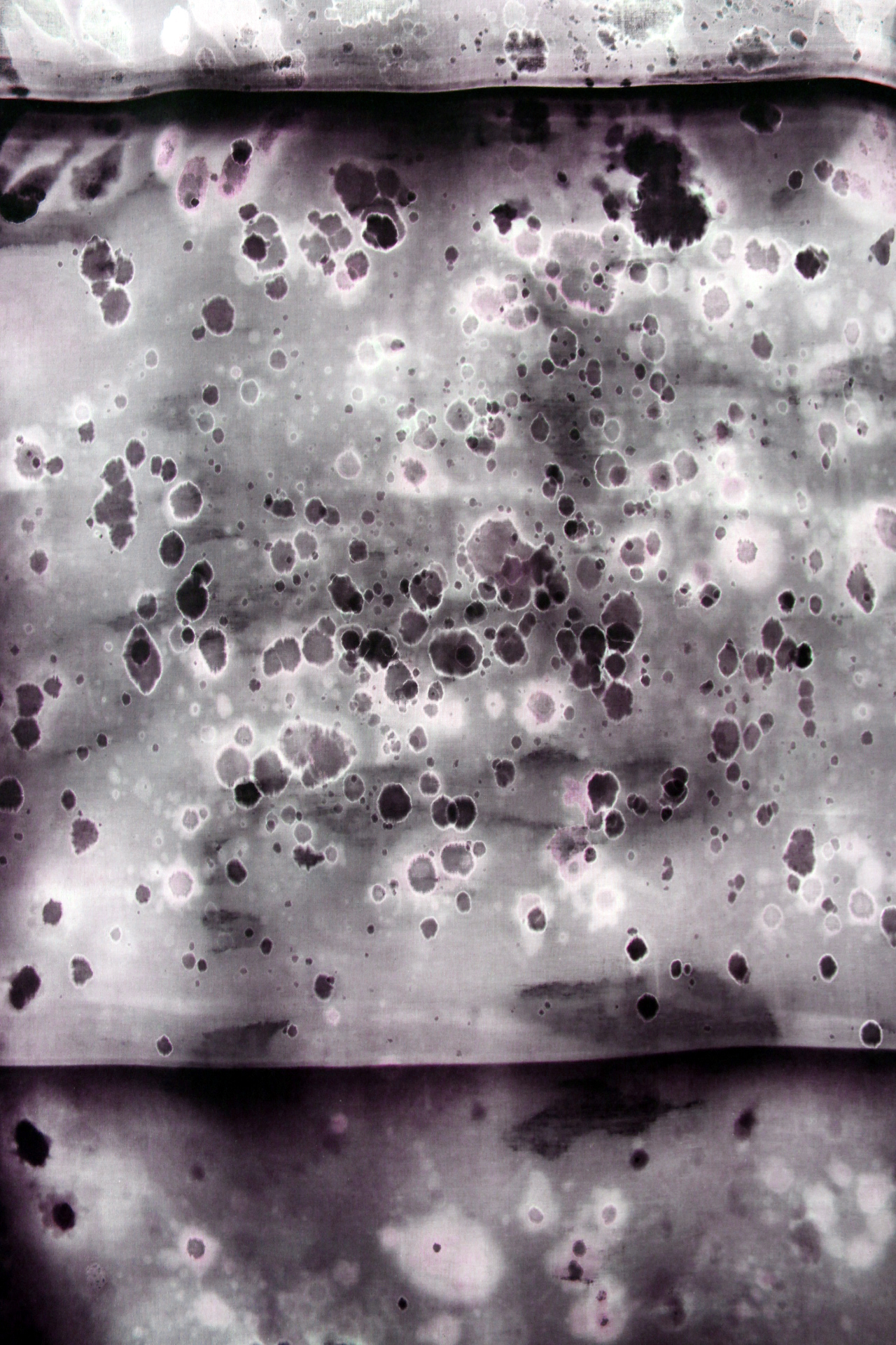 This project started as a material experiment in 2014 and deals with the subject of decay, destruction and transformation. It relates to circular processes in nature and to the idea that to create something, something else needs to be destroyed. Black is seen as ‘no colour’, and is often experienced as ‘intense’. In order to create the black colour in printing and dying techniques, all colours need to be apparent. This might explain why it was once the most expensive colour to make. The artist used the fact that black has all colours in it by destructing it’s components in different ways, hence creating colour pallets in the process. By experimenting with various techniques and chemicals, such as discoloration (similar to bleach), she created layers and different colours.